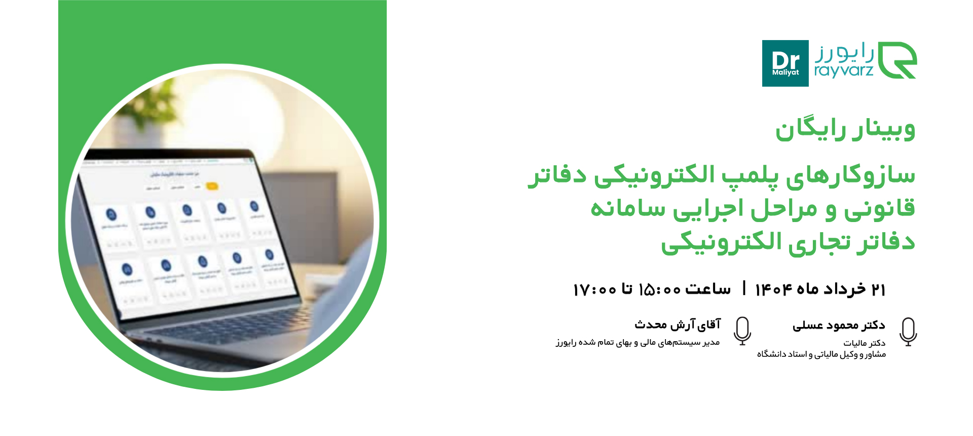 گروه مهندسی نرمافزار رایورز با درک اهمیت تحول جدید در حوزه ثبت و نگهداری دفاتر قانونی، وبیناری آموزشی و تخصصی برگزار میکند. در این نشست، مبانی، سازوکارهای پلمپ الکترونیکی دفاتر قانونی، مراحل اجرایی سامانه دفاتر تجاری، و نیز مزایا و چالشهای پیشرو بهصورت دقیق و کاربردی تشریح خواهد شد.